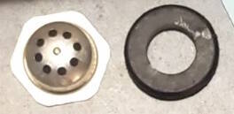 Modern replacement metal piston with thin "washer" permanently attached to it. (The "washer" is the thin black material with six holes punched in it):